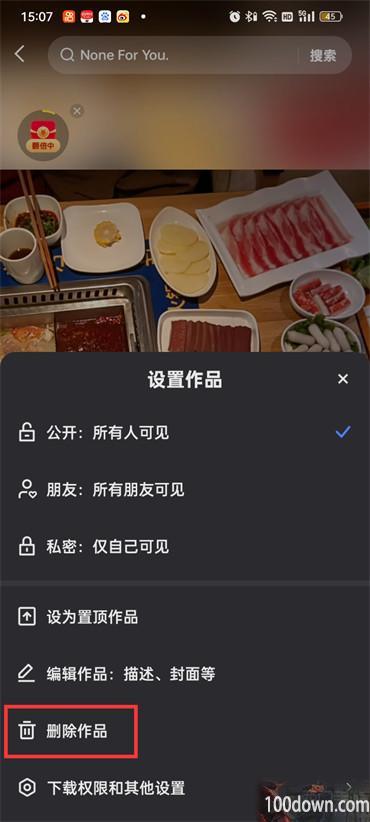 4.在页面下面弹出的作品设置的对话框中点击【删除作品】;