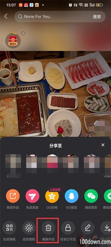 4.点击过分享之后在页面下面弹出的对话框中滑动找到【删除作品】点击;