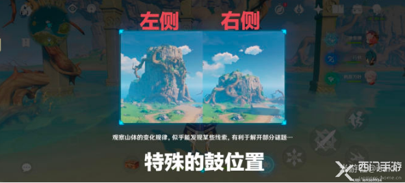 2、前往下图位置,这里会有一个“特殊的鼓”,玩家靠近鼓点击“改变山体”的交互键就可以调整山的高度,站在鼓的位置往两座山方向看,右侧就是矮一点的,玩家要调成右侧这种形态;