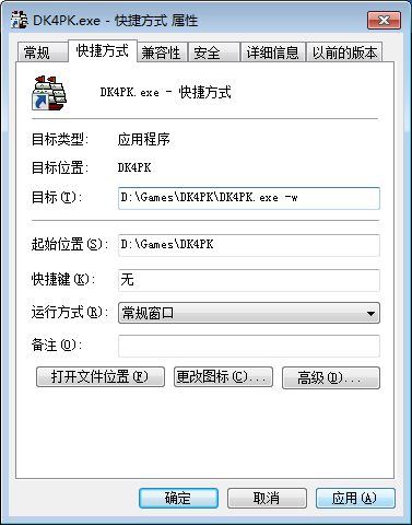 先看DK4PK文件夹下有没有文件EmuCDA.dll,如果有,右键点击DK4PK.exe文件,在菜单上选“发送”——“桌面快捷方式”,然后到桌面上找到“DK4PK.exe - 快捷方式”,右键点击该快捷方式,选“属性”,应该能看到“目标(T):”后面有“路径DK4PK.exe”,在这个后面添加一个空格,再加-w,变成“路径DK4PK.exe -w”,然后确定。