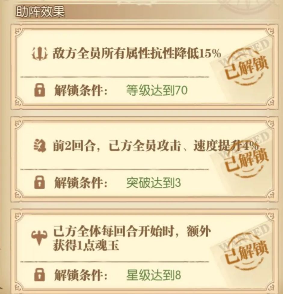 天赋说明:战斗开始时,攻击、速度、命中提升,最大生命值、所有伤害加成、所有伤害减免提升,回合开始时,额外获得魂玉和怒气,新世界佩罗娜攻击比自己速度低的目标时,附加一定百分比的暗属性伤害。