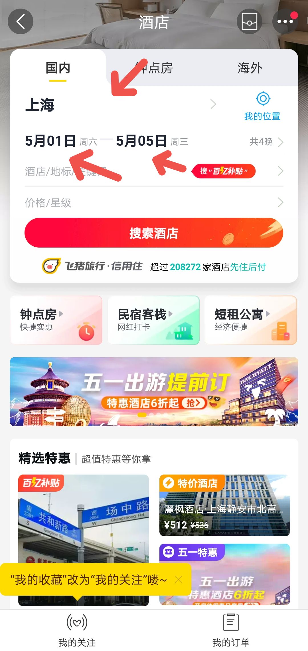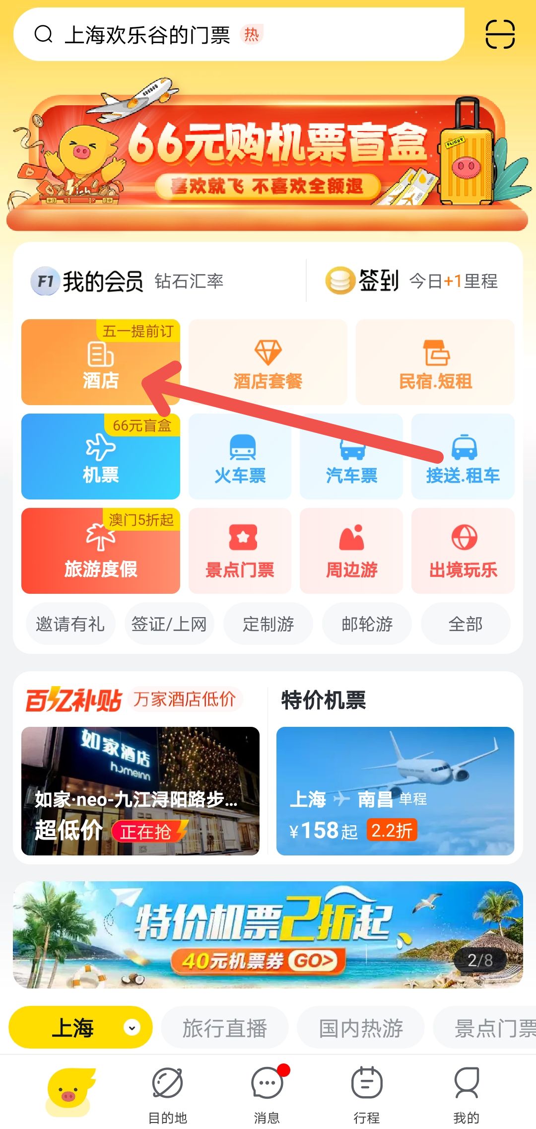 飞猪旅行怎么提前预定五一假期的酒店?五一快到了,有非常多的小伙伴们想出门游玩,五一假期的酒店非常火爆,但是还有很多小伙伴们没有提前预定好酒店,那怎么提前预定五一假期的酒店呢?接下来我将教你怎么在飞猪上提前预定五一假期的酒店。