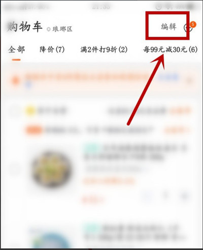 在购物车页面中,点击右上角的编辑功能选项,进入到购物车编辑页面。