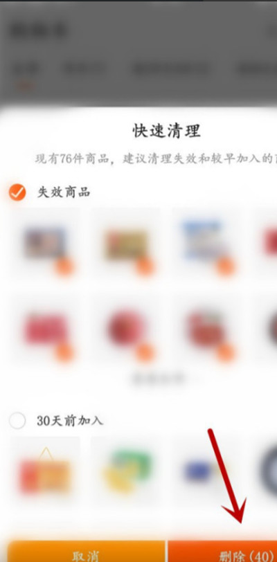 在快速清理功能启动时,系统会自动帮用户选择勾选失效商品,点击右下角的删除选项,即可清理失效商品。
