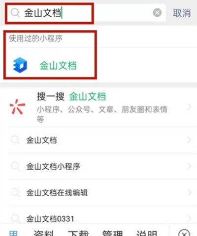 首先需要用户打开微信,进入到主页面,在上方的搜索栏中查找金山文档,点击并进入到金山文档的小程序中。