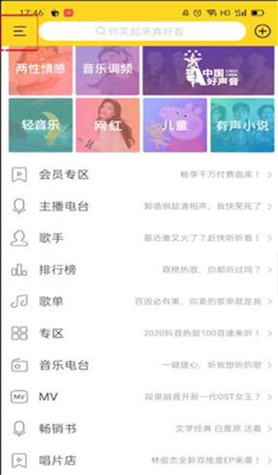 首先我们找到酷我音乐之后进入,在主界面左上角可以看到三横的图标,点击这个图标。