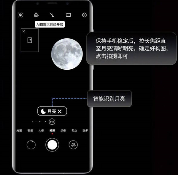 在华为设备中有专门的月亮模式,我们需要选择华为的月亮模式,这样就可以进行拍摄了。