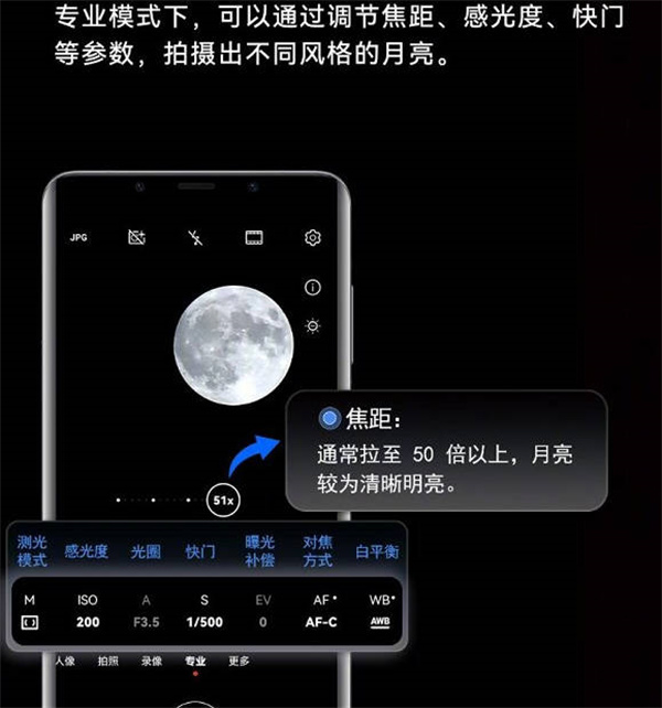 当然了,除了这个以外,还能自己手动调整数值,我们可以手动把焦距拉到五十倍以上,还能调节感光度,光圈,快门,曝光补偿,白平衡等等的数值。