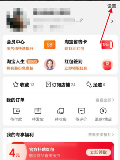 首先需要用户打开淘宝,进入到我的页面中,找到右上角设置功能的选项图标,点击并进入到设置功能的页面中。