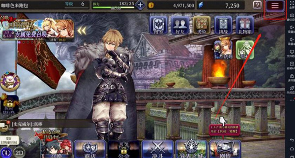 1、首先我们登录游戏进入到最终幻想勇气启示录的主界面,在主界面的右上方大家可以看到一个三条杠的图标,如图所示位置,我们点击进入;