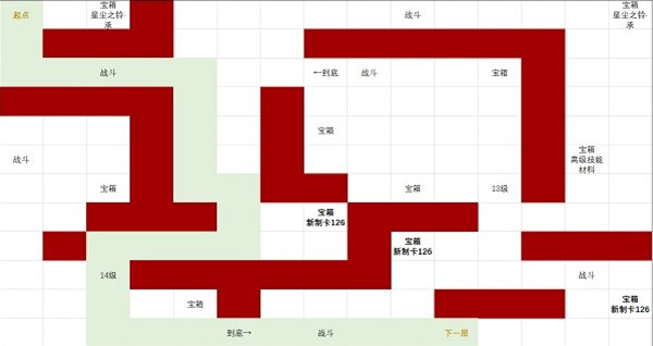 1:如图所示,我们可以看到红色的就是墙壁,白色的区域是可以行走的,宝箱,战斗时间都是需要去拿的,增加我们的探索度;