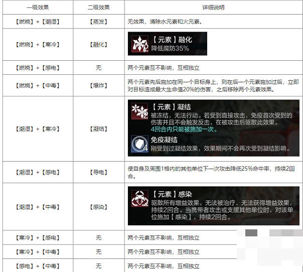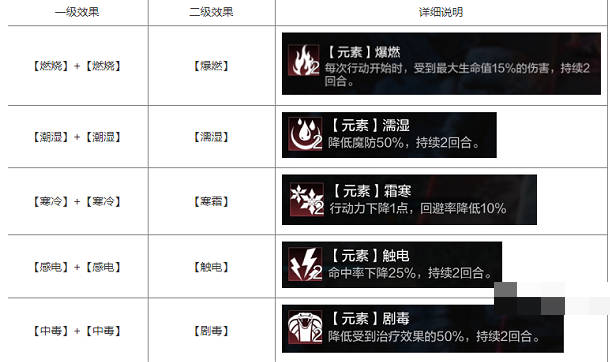 1:一级元素效果,首先在游戏中有五个元素,火,水,冰,雷,毒,所有的法师都会拥有上面的属性之一,如图所示,然后燃烧,潮湿,寒冷,感电,中毒;