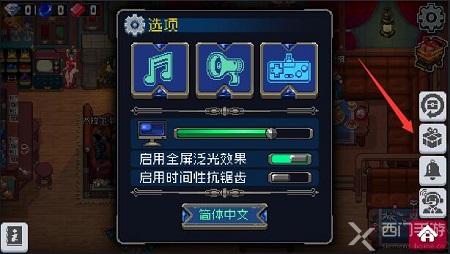 2、点击后进入游戏设置界面,在这里可以对游戏声音等内容进行设置,在右侧的位置有一个礼包样式的按钮,点击一下;